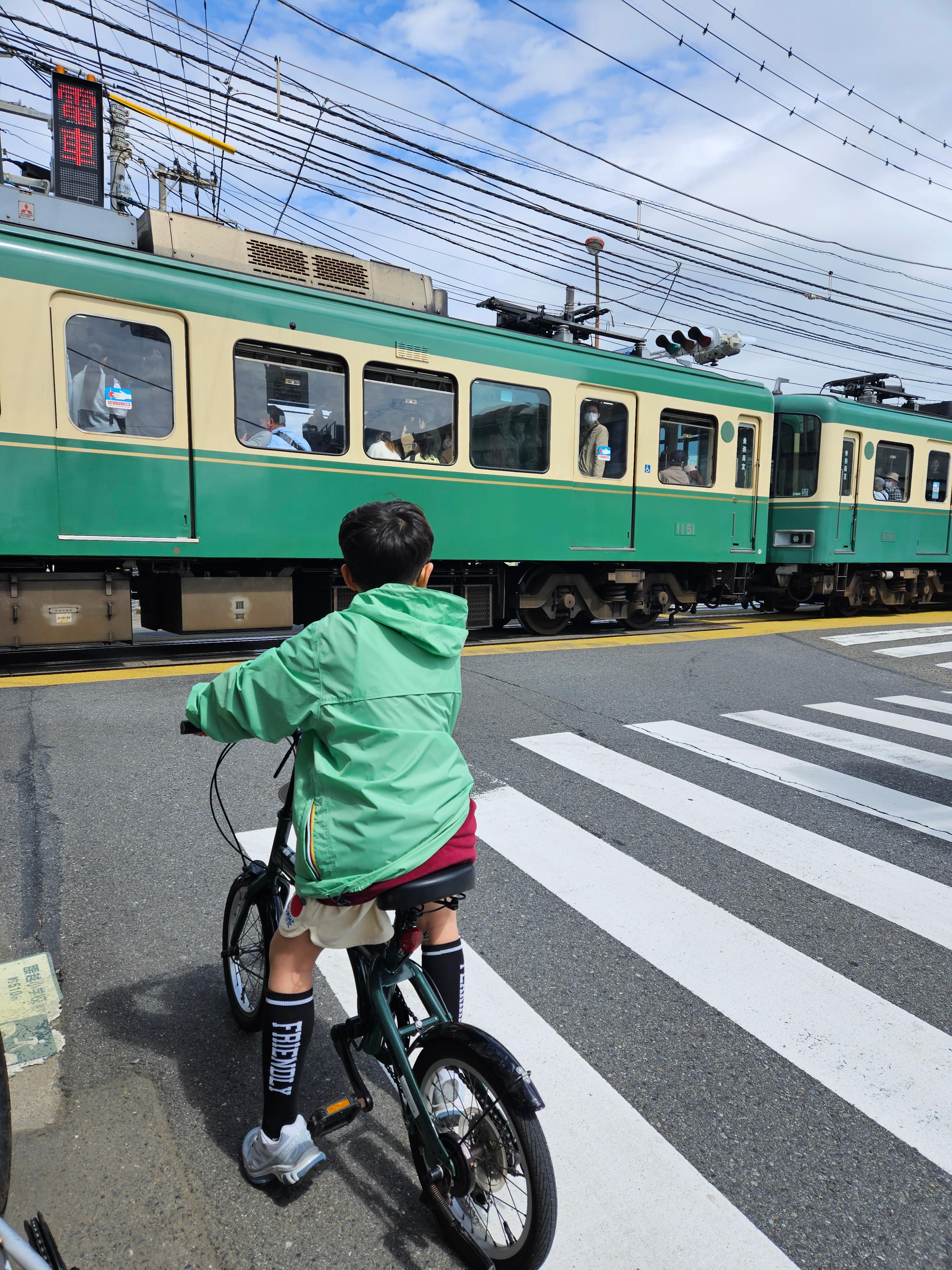 건널목을 지나며, 아이와 나는 마치 하나가 된 듯, 기차와 자전거가 만든 하모니 속에서 시간을 보냈다.